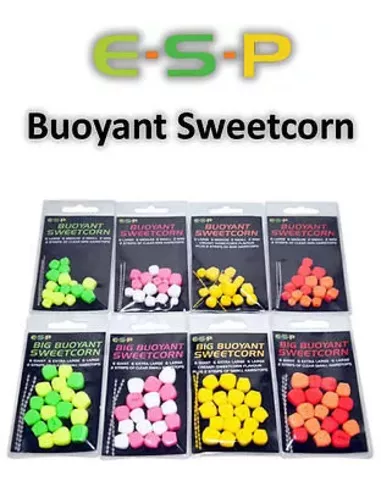 Een verpakking ESP drijvende imitatie maïs bevat 16 (verschillende maten) korrels maïs en 2 ESP Hair Stops. Een innovatief kenmerk van deze maïs is dat enkele stuks zijn uitgevoerd met een uitsparing voor de Hair Stop. Deze bevindt zich aan het uiteinde of aan een zijkant van de maïs. Hierdoor kunt u de positie aanpassen aan uw aaspresentatie. Door deze uitsparing steekt er niets uit waardoor het moeilijker wordt voor onder andere krabbetjes om de maïs te stelen. De verpakking bevat ook korrels zonder uitsparing. Perfect voor vele aasaanbiedingen voor zowel karper als brasem. Een verpakking bevat 6 grote, 6 medium, 2 kleine en 2 mini korrels maïs.