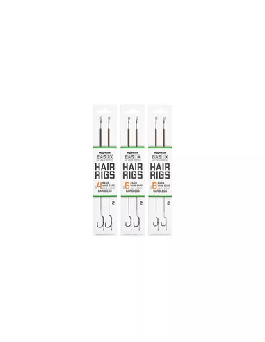 De BASIX Ready Tied Hair Rigs zijn klaar om gelijk uit de verpakking gebruikt te worden. Je hoeft enkel nog een bodemaas of wafter toe te voegen en je bent klaar om te vissen. De rigs zijn geknoopt met het camo green gekleurde BASIX Coated Hooklink materiaal. Een klein gestript stukje bij de BASIX Wide Gape haak zorgt voor bewegingsvrijheid en grotere kans op goede inhaking. De onderlijn heeft een soepele hair die is voorzien van een stukje silicone die hem op zijn plek houdt en de kans op in de war werpen verkleint. De lengte van de hair is geoptimaliseerd voor haakaas formaten die passen bij de gekozen haakmaat.