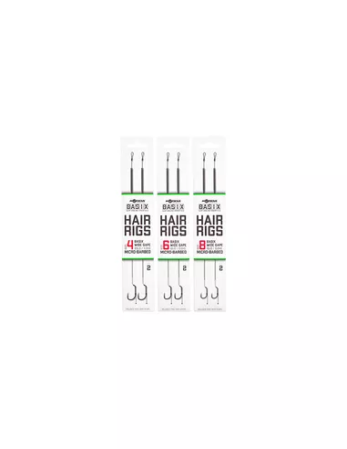 De BASIX Ready Tied Hair Rigs zijn klaar om gelijk uit de verpakking gebruikt te worden. Je hoeft enkel nog een bodemaas of wafter toe te voegen en je bent klaar om te vissen. De rigs zijn geknoopt met het camo green gekleurde BASIX Coated Hooklink materiaal. Een klein gestript stukje bij de BASIX Wide Gape haak zorgt voor bewegingsvrijheid en grotere kans op goede inhaking. De onderlijn heeft een soepele hair die is voorzien van een stukje silicone die hem op zijn plek houdt en de kans op in de war werpen verkleint. De lengte van de hair is geoptimaliseerd voor haakaas formaten die passen bij de gekozen haakmaat.