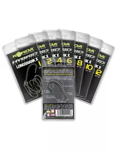 De Hybrid Longshank X is speciaal gemaakt voor moeilijke wateren waar de vissen ware meesters zijn geworden in het ontlopen van onze rigs. Door de rechte punt is dit model haak veel eerder geneigd om te prikken in de bek. Dit wordt nog eens versterkt doordat het haakoog iets naar binnen gebogen is, hierdoor krijgt de haak het zogenaamde: ”line aligner” effect. De haak is erg sterk in vergelijking met zijn soortelijk gewicht en daarom is deze haak in vele omstandigheden inzetbaar. De haak is echter perfect in situaties waarin “scherp” gevist dient te worden om een aanbeet te krijgen.