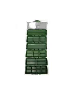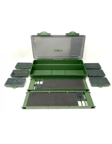Een complete tacklebox die geleverd wordt inclusief 2 rig boards en 6 kleinere doosjes voor accessoires.